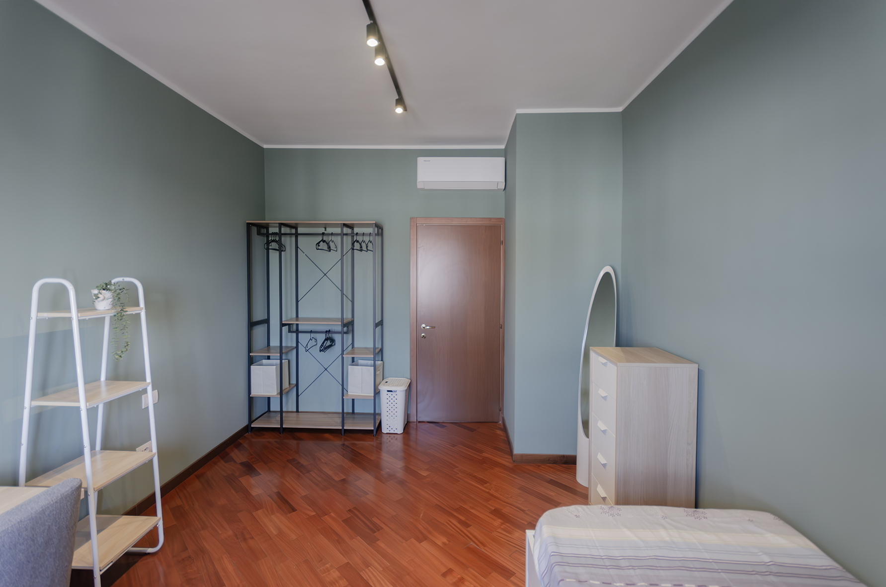 The room has just been renovated is furnished with single bed, desk, chair, and wardrobe.