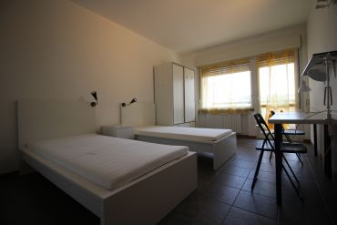The single room is big and bright, furnished with bed, wardrobe and desk.