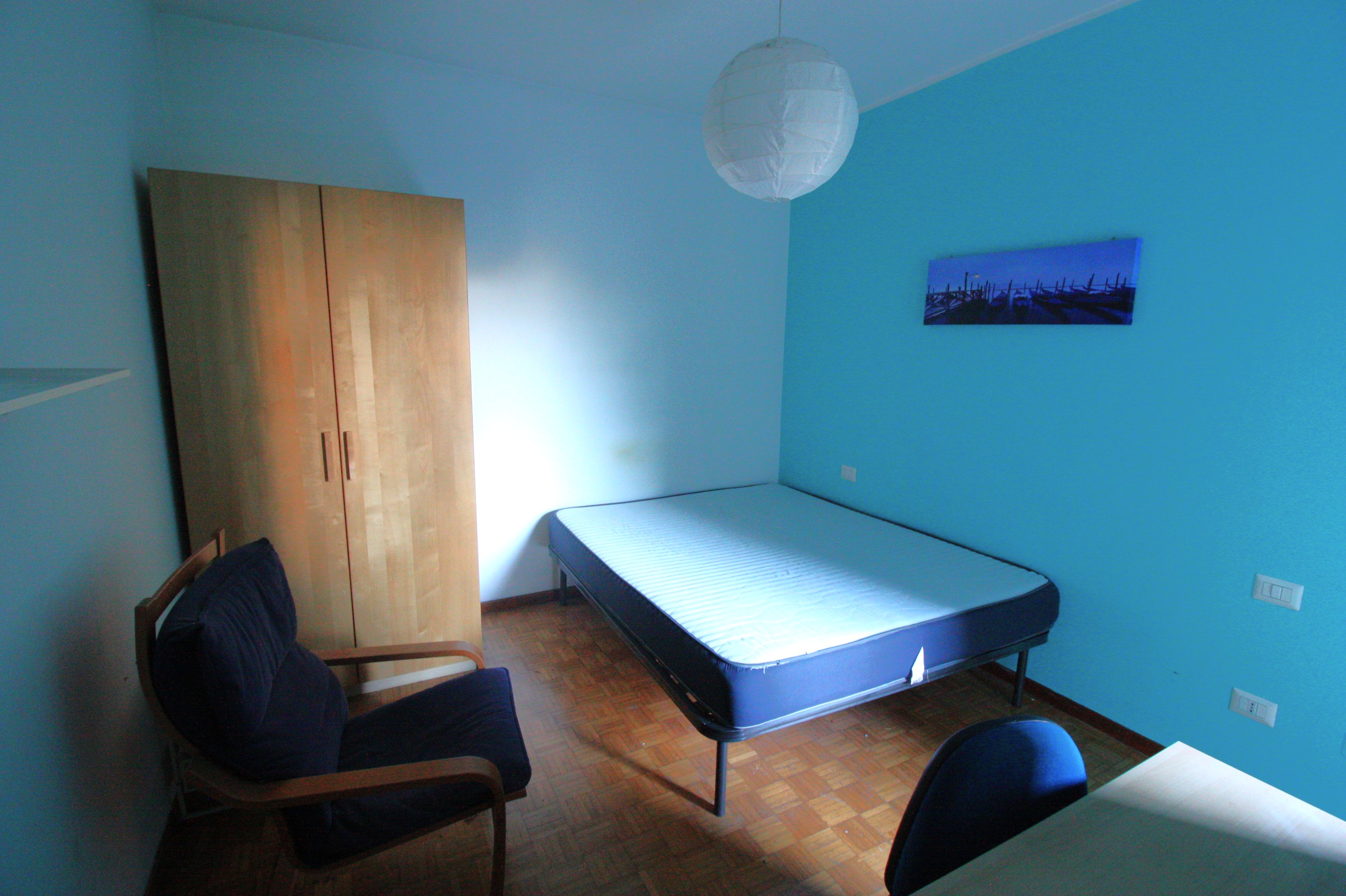 Camera singola cn letto ad una piazza e mezzo, armadio, poltrona, sedia e scrivania e balcone.