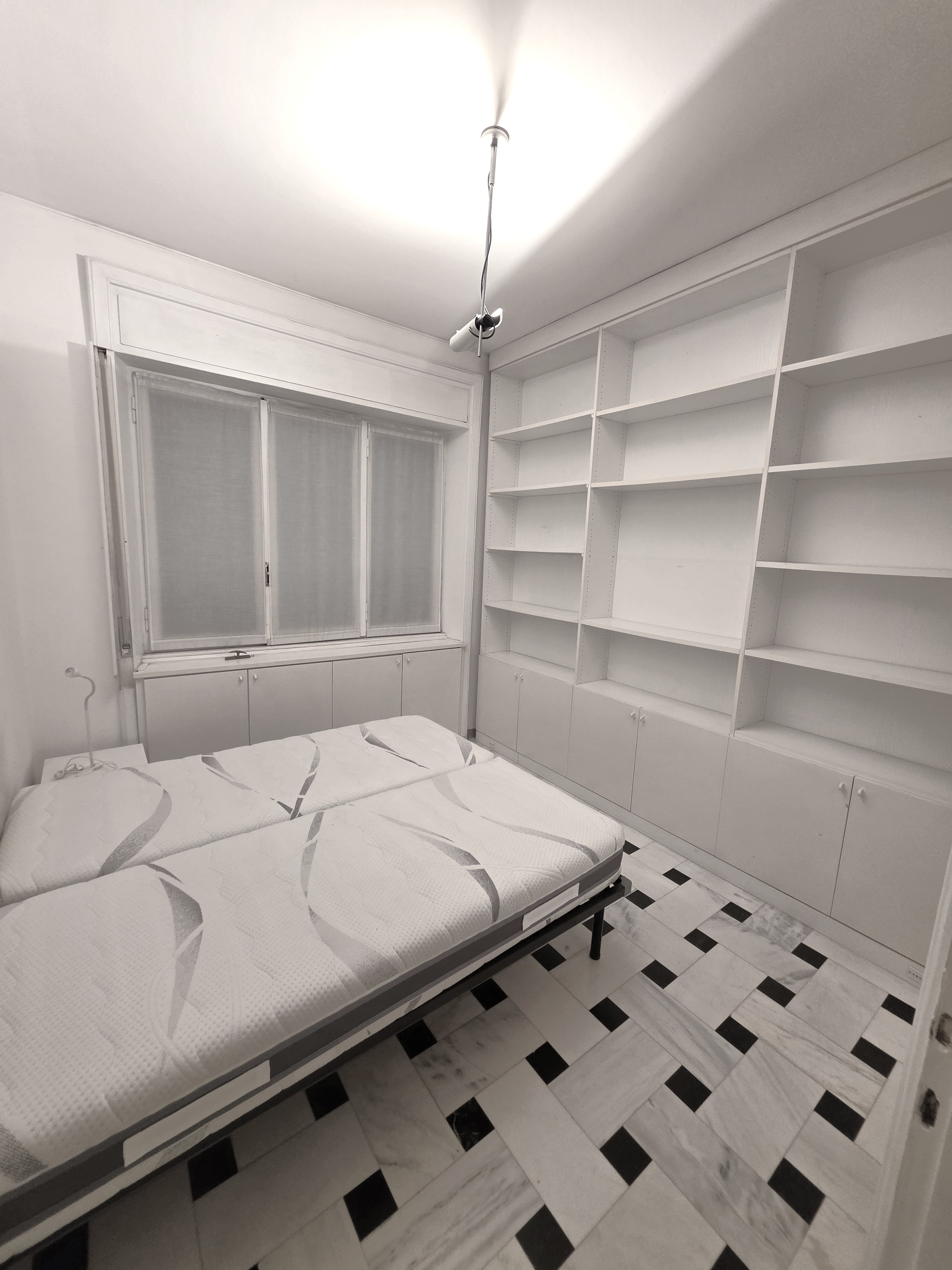 Camera con due letti singoli, grande armadio, mobile con scaffalature e ante.