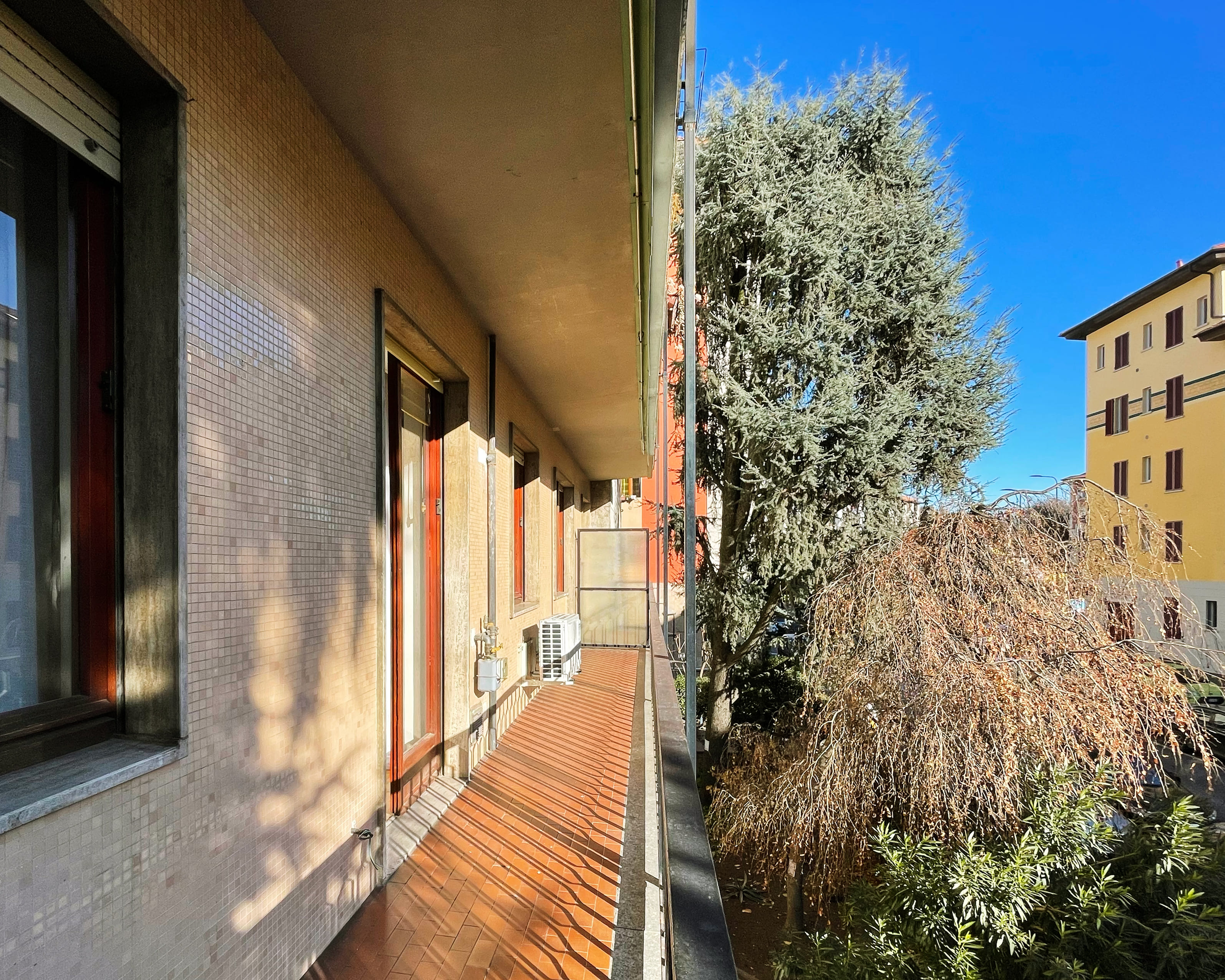 Entrambe le camere godono di un accesso diretto a un balcone comunicante con affaccio su strada e su una piacevole area verde.