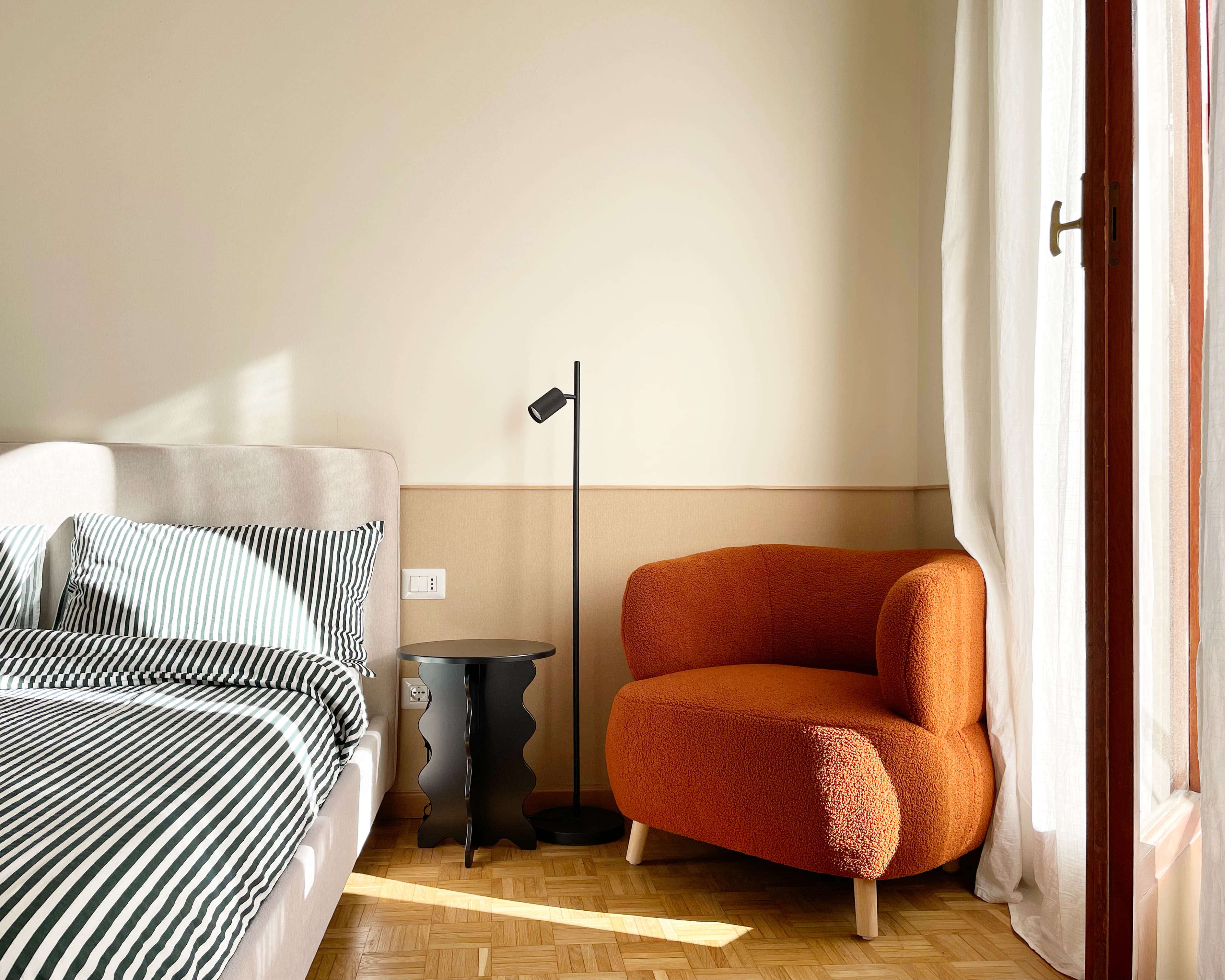 Ogni stanza è dotata di letto matrimoniale, armadio capiente, scrivania per lo studio/smart-working, libreria e poltrona relax.