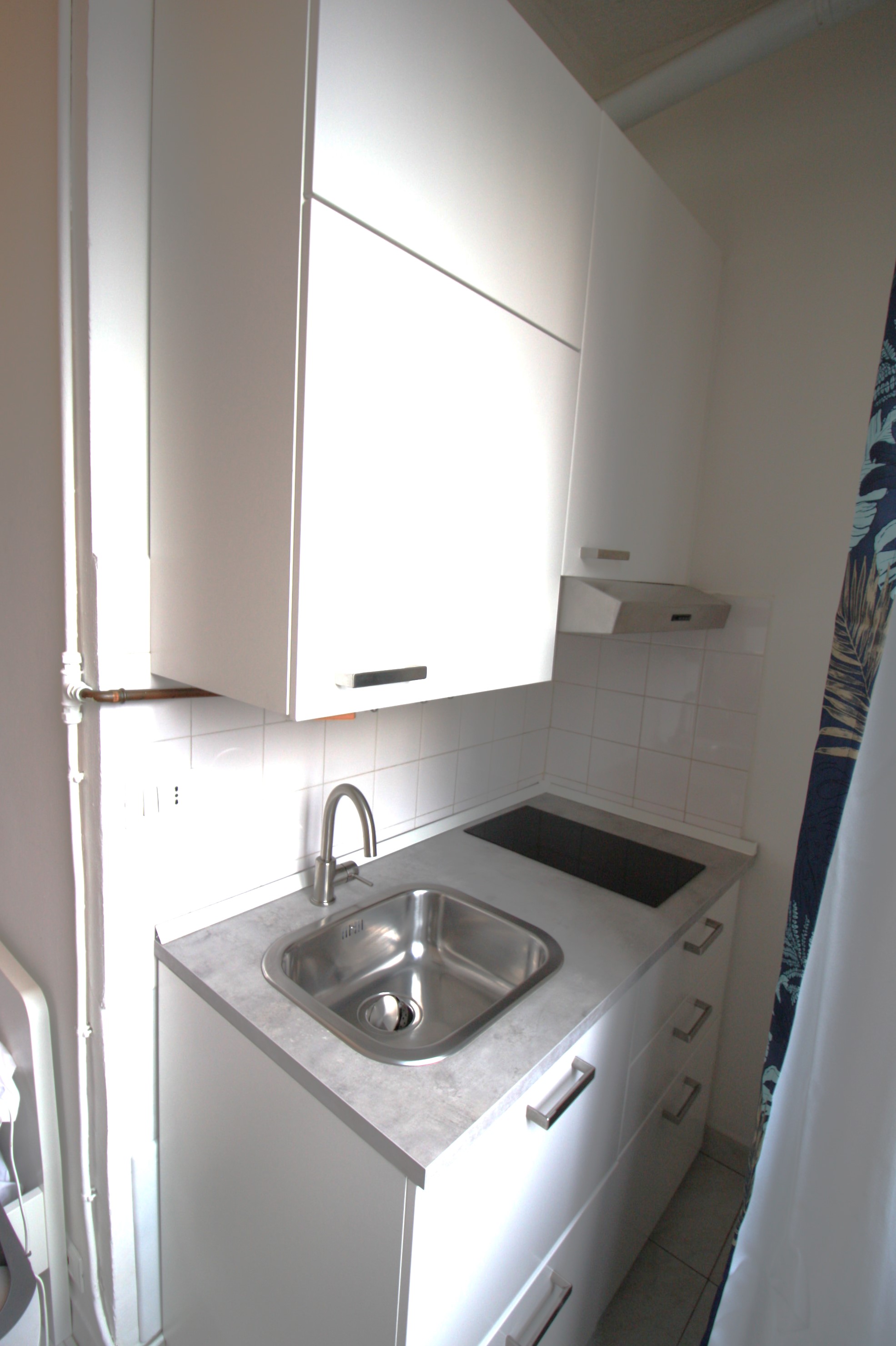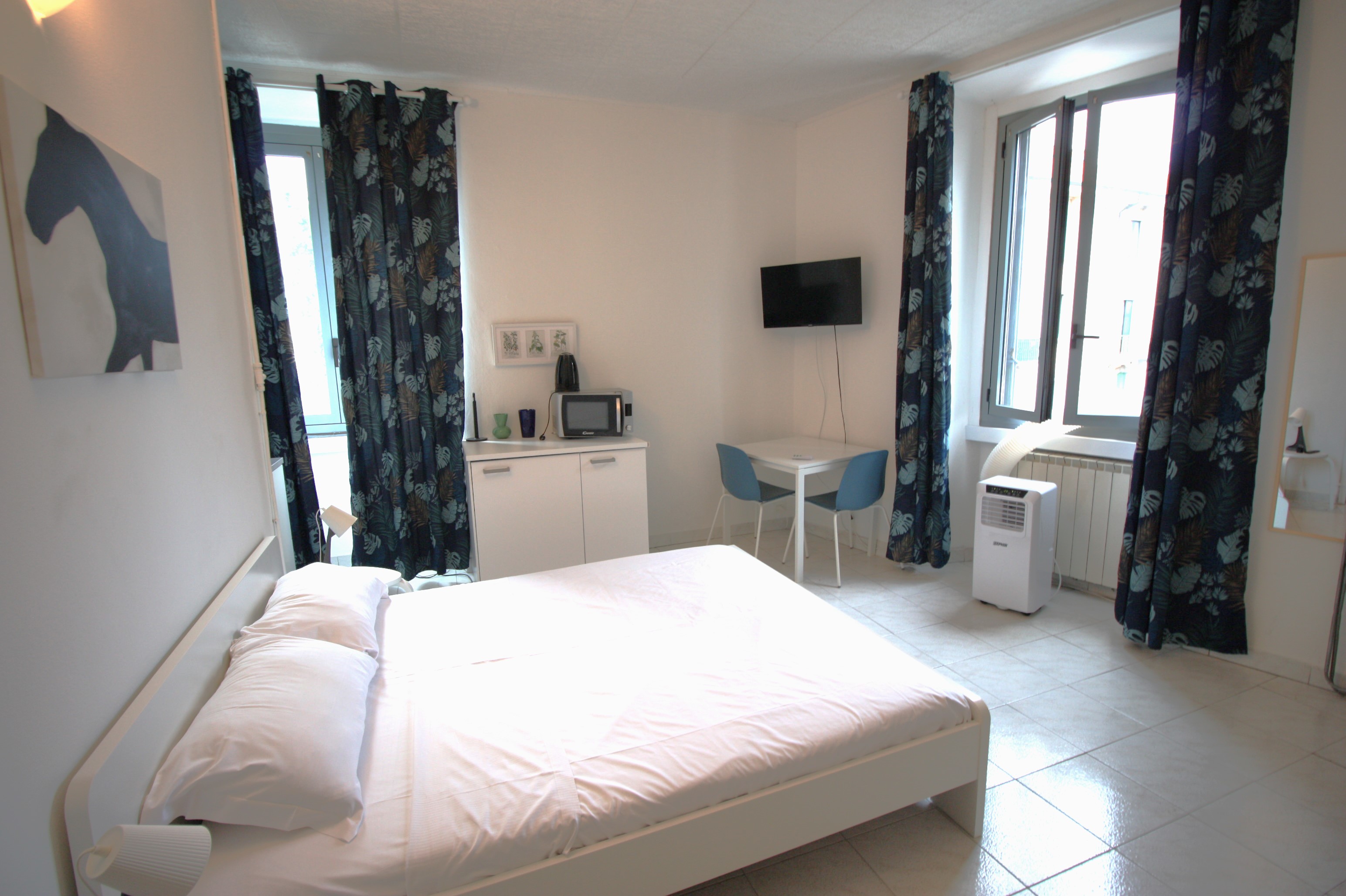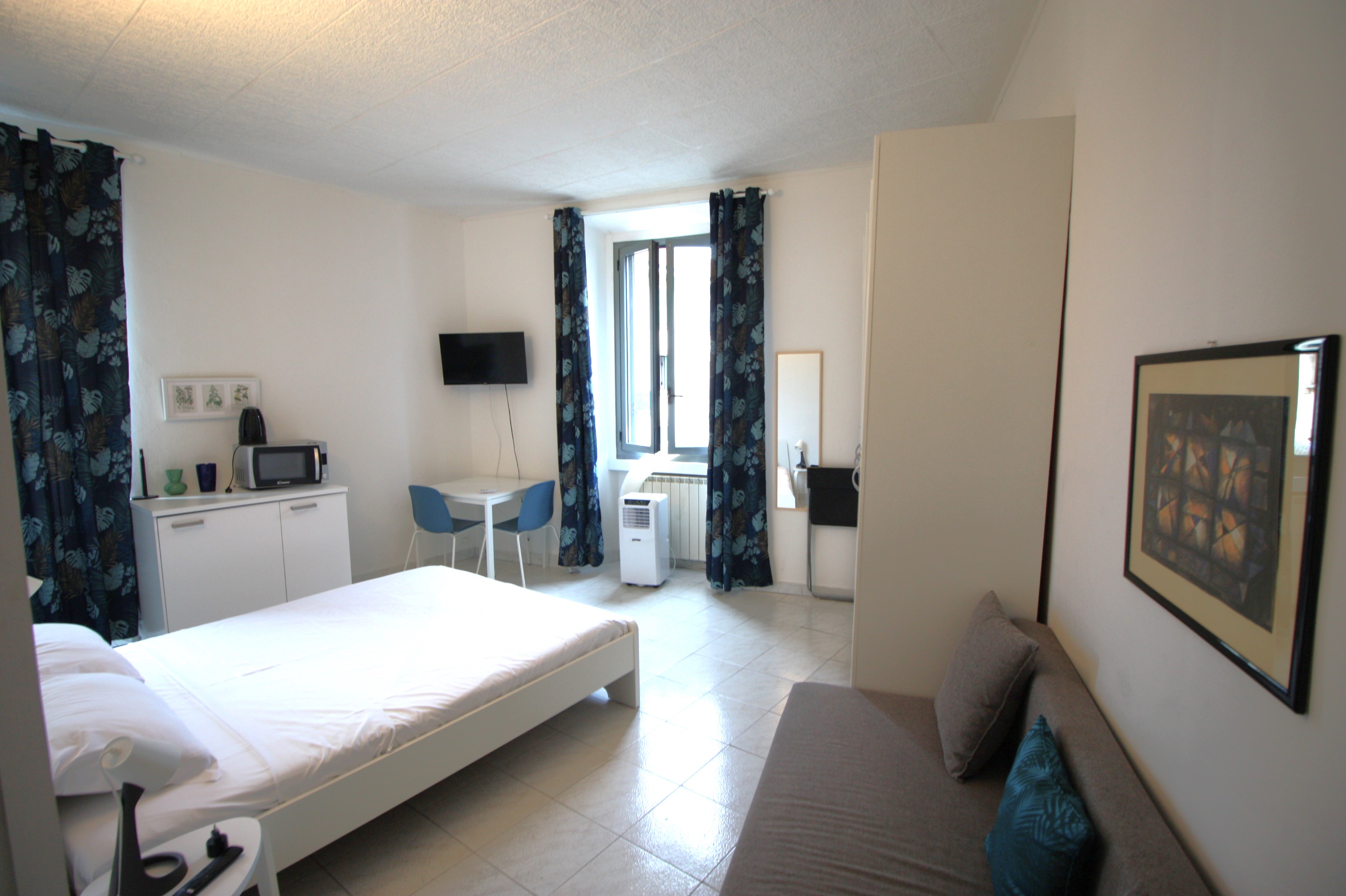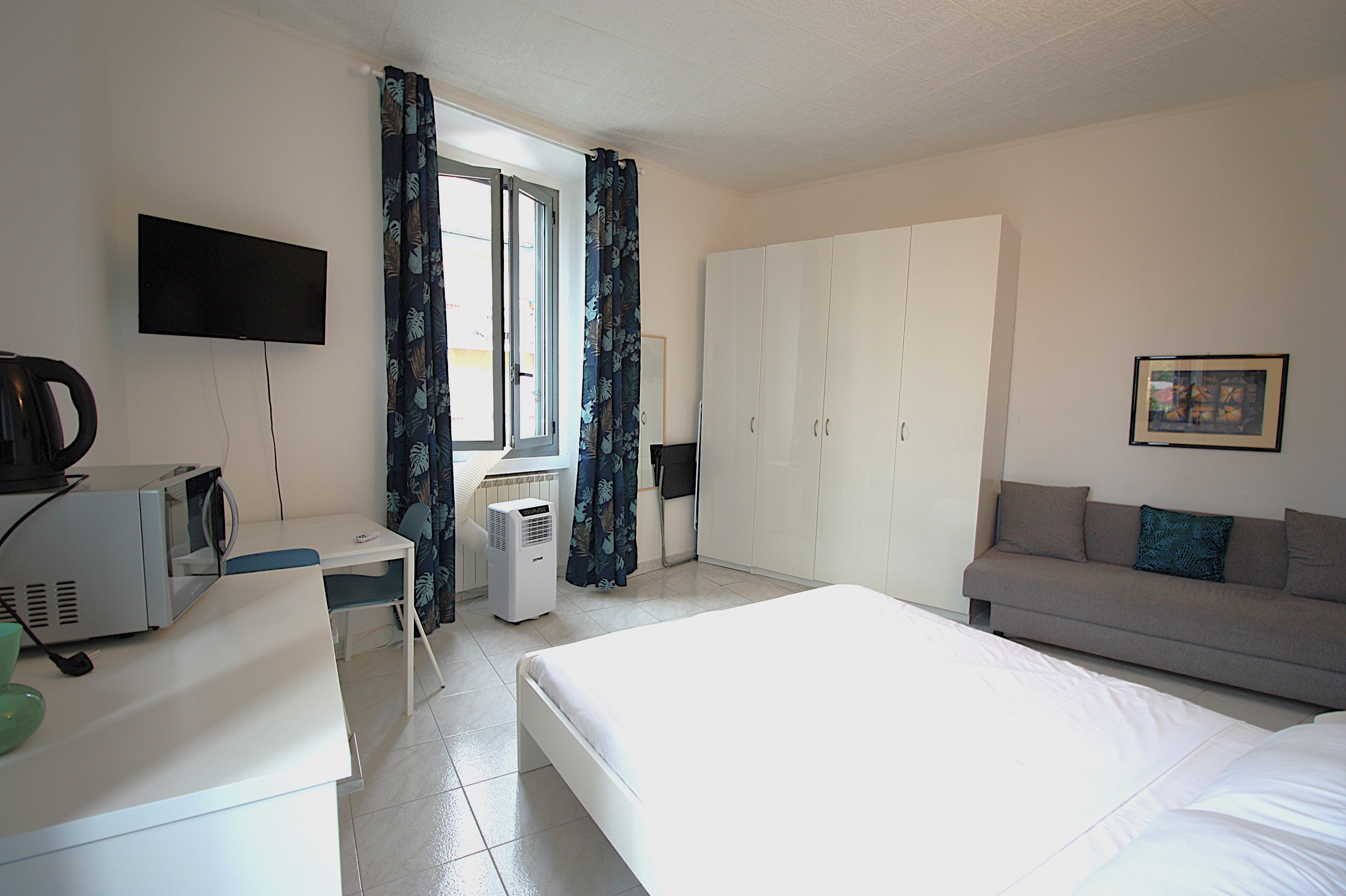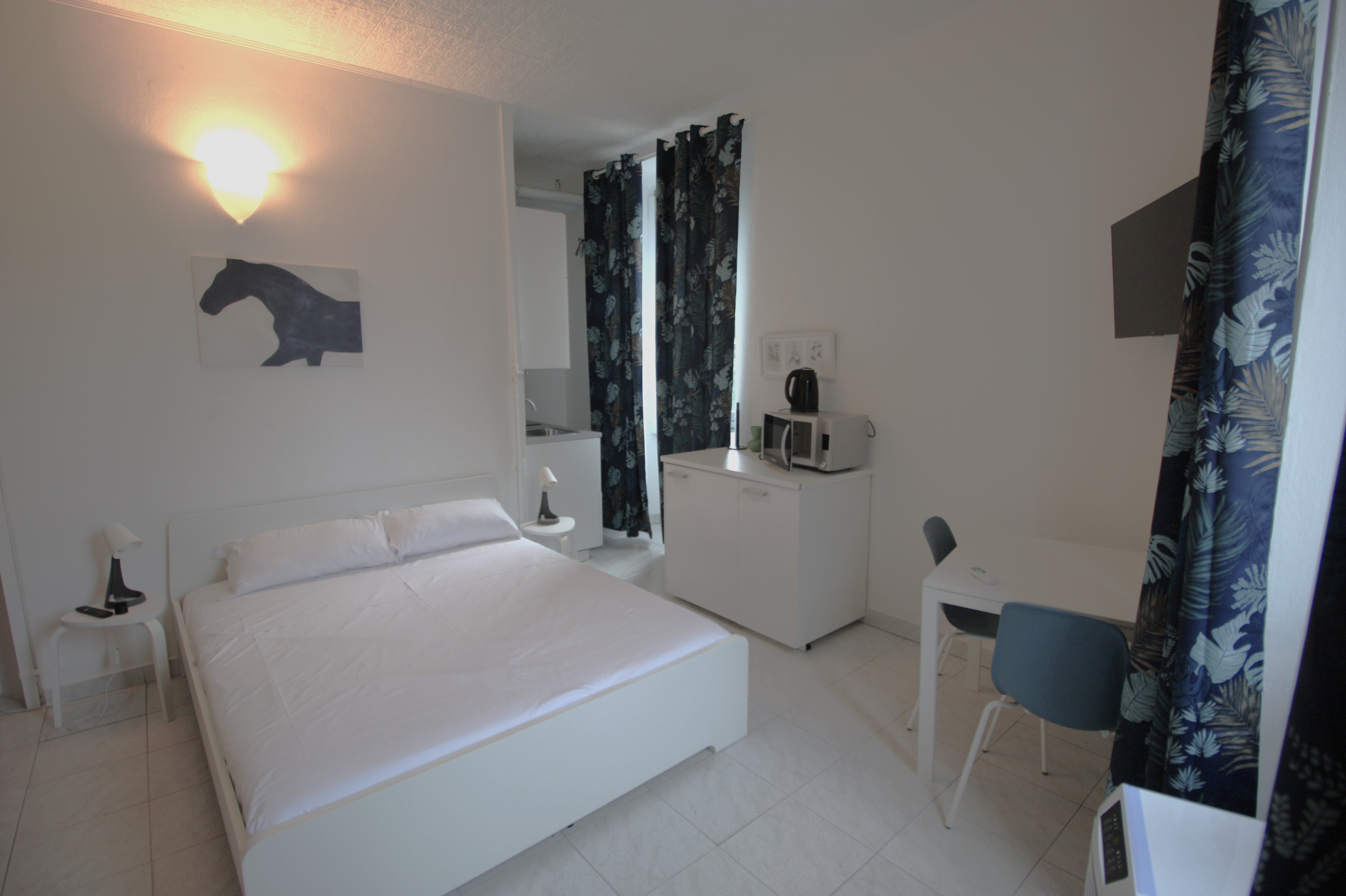 Lovely and bright studio apartment recently renovated consisting of an entrance with lowered space for storage space above, large single space with king sized bed, sofa, study area with desk and chair, kitchenette and bathroom with shower.