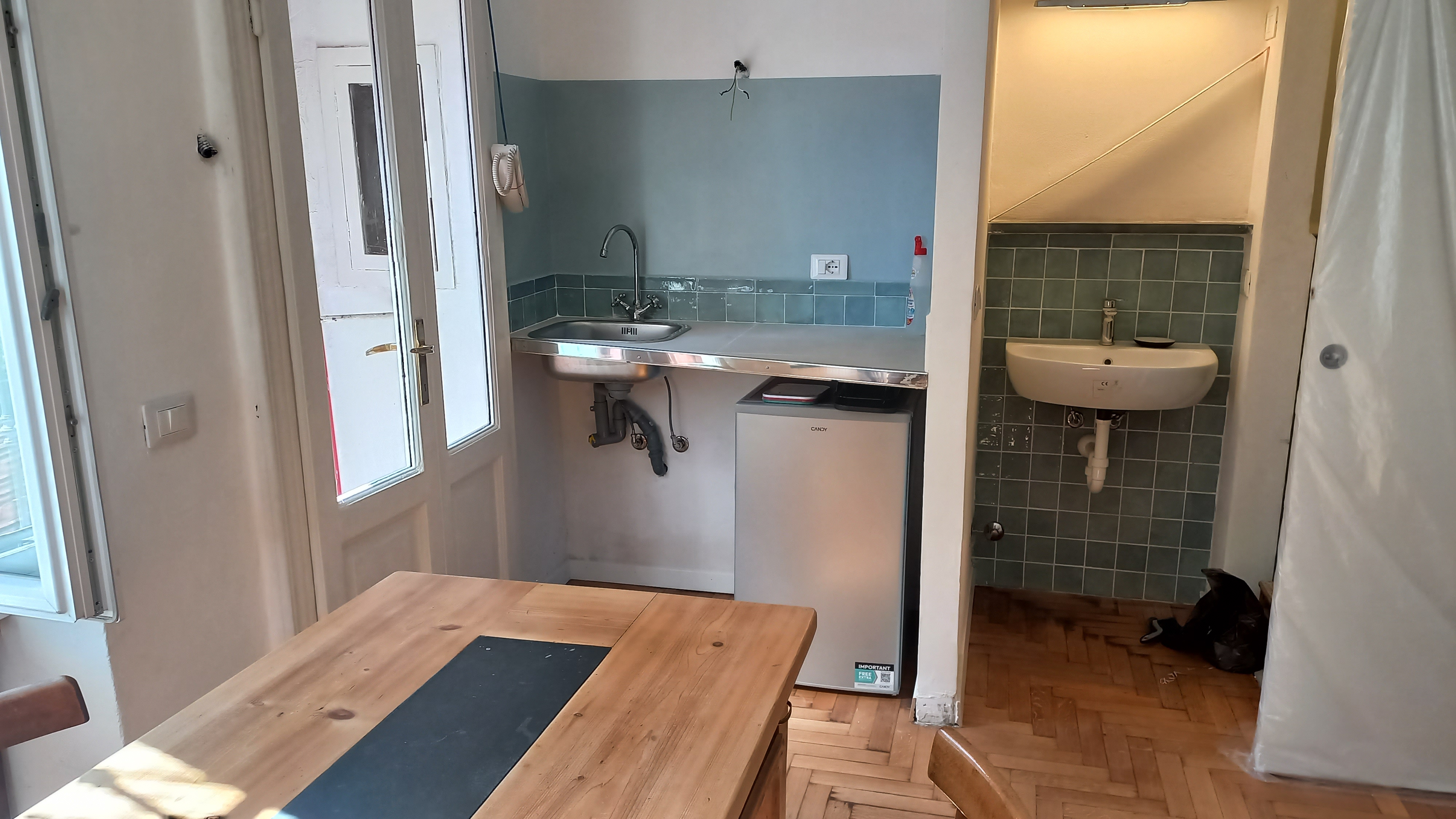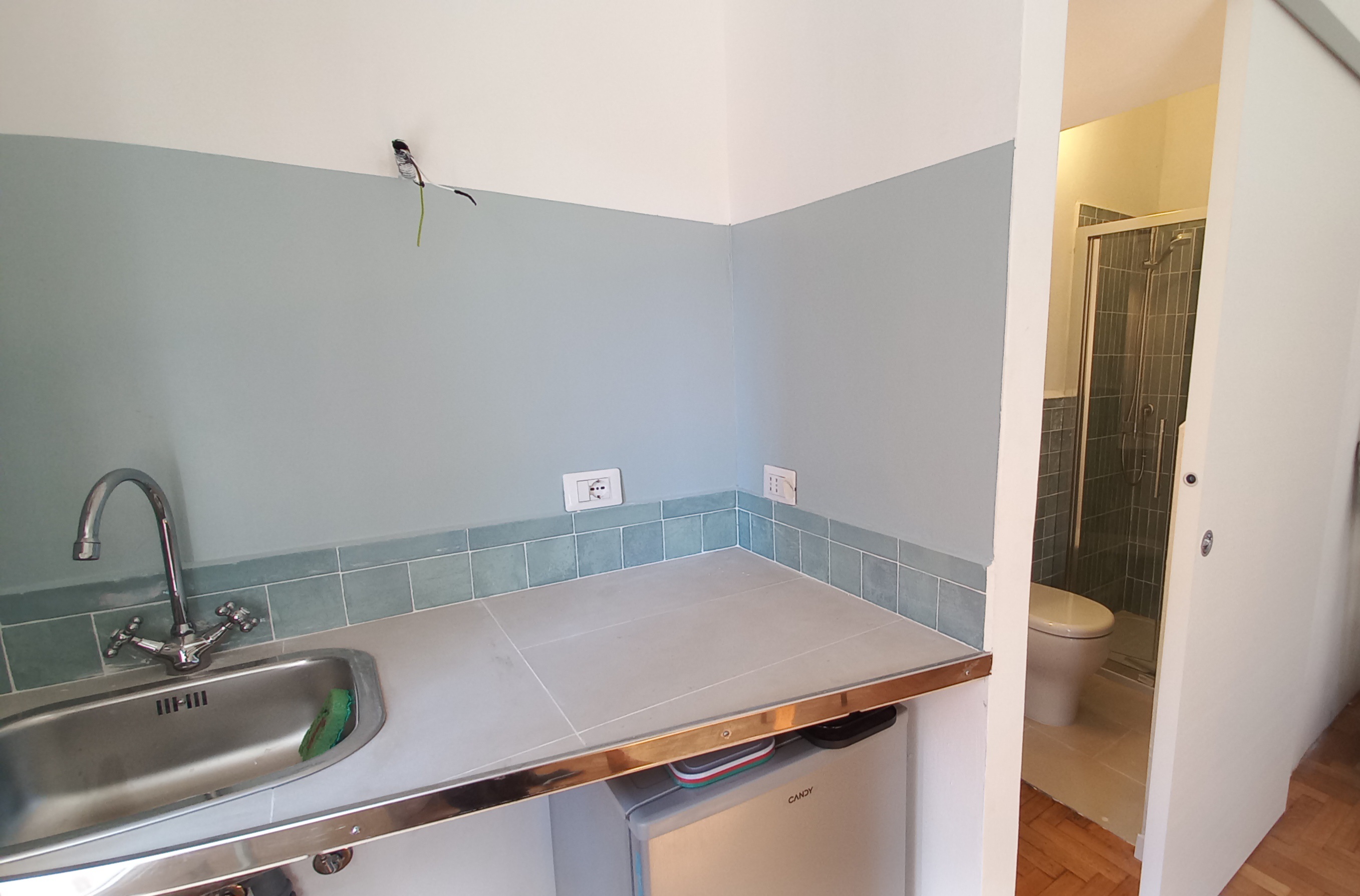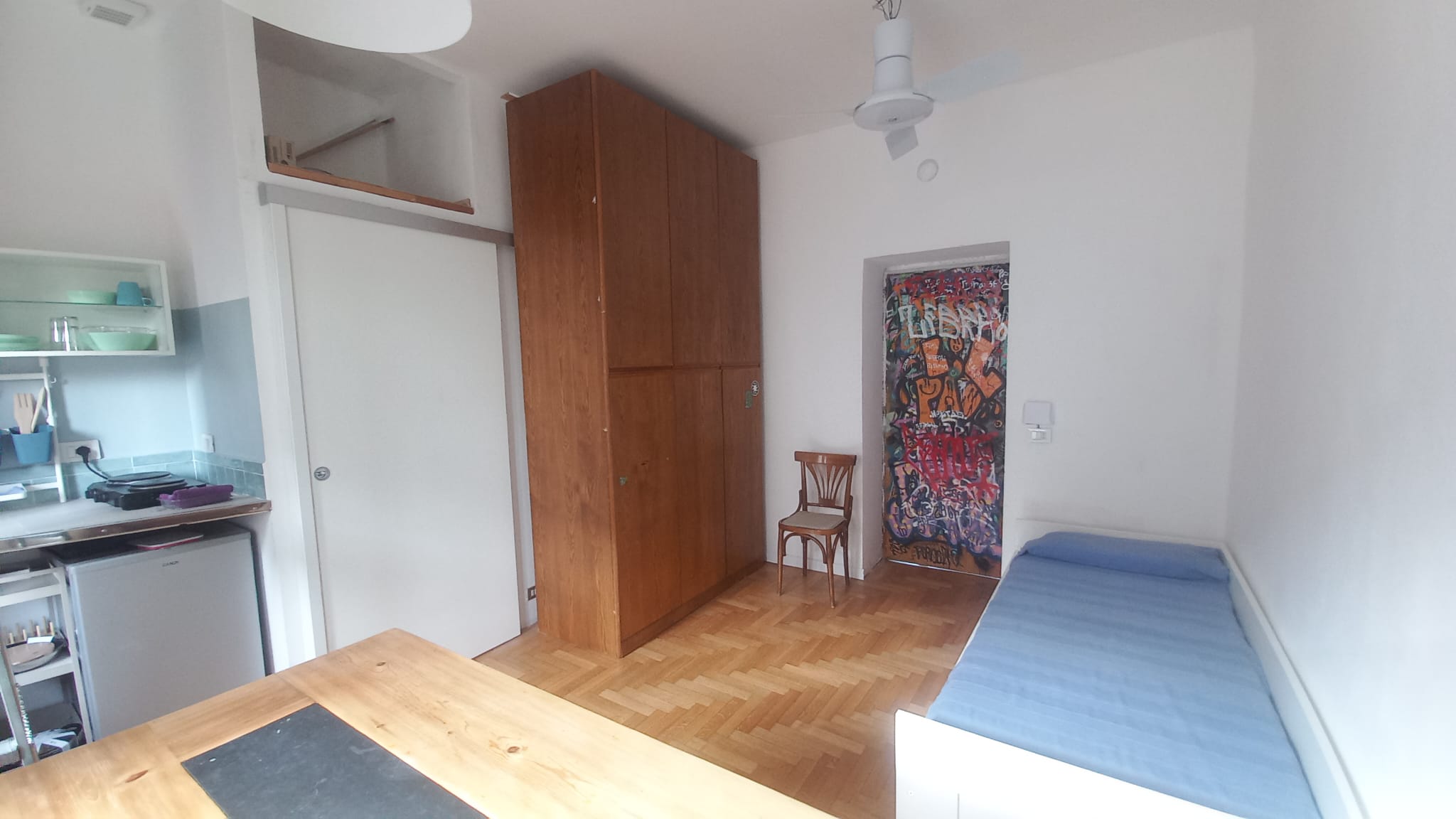 The apartment features a well-organized open space with a fully equipped kitchenette and a sleeping area with a single bed. The private bathroom includes a shower. The furniture is simple and functional — perfect for students looking for a practical, well-connected place to live.