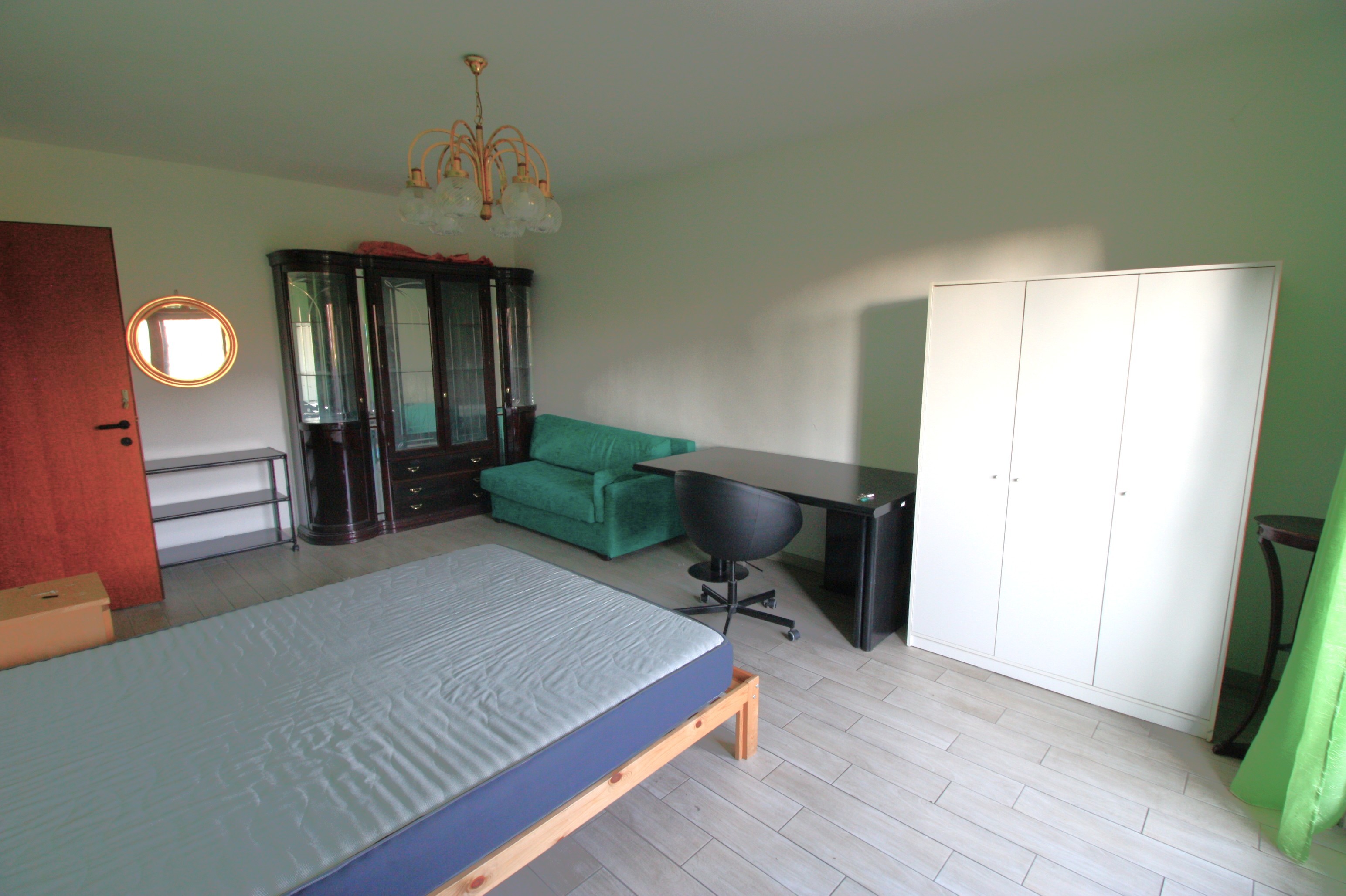 Large single room with double bed, sofa, armchair, desk and chair, wardrobe, display cabinet and small balcony.