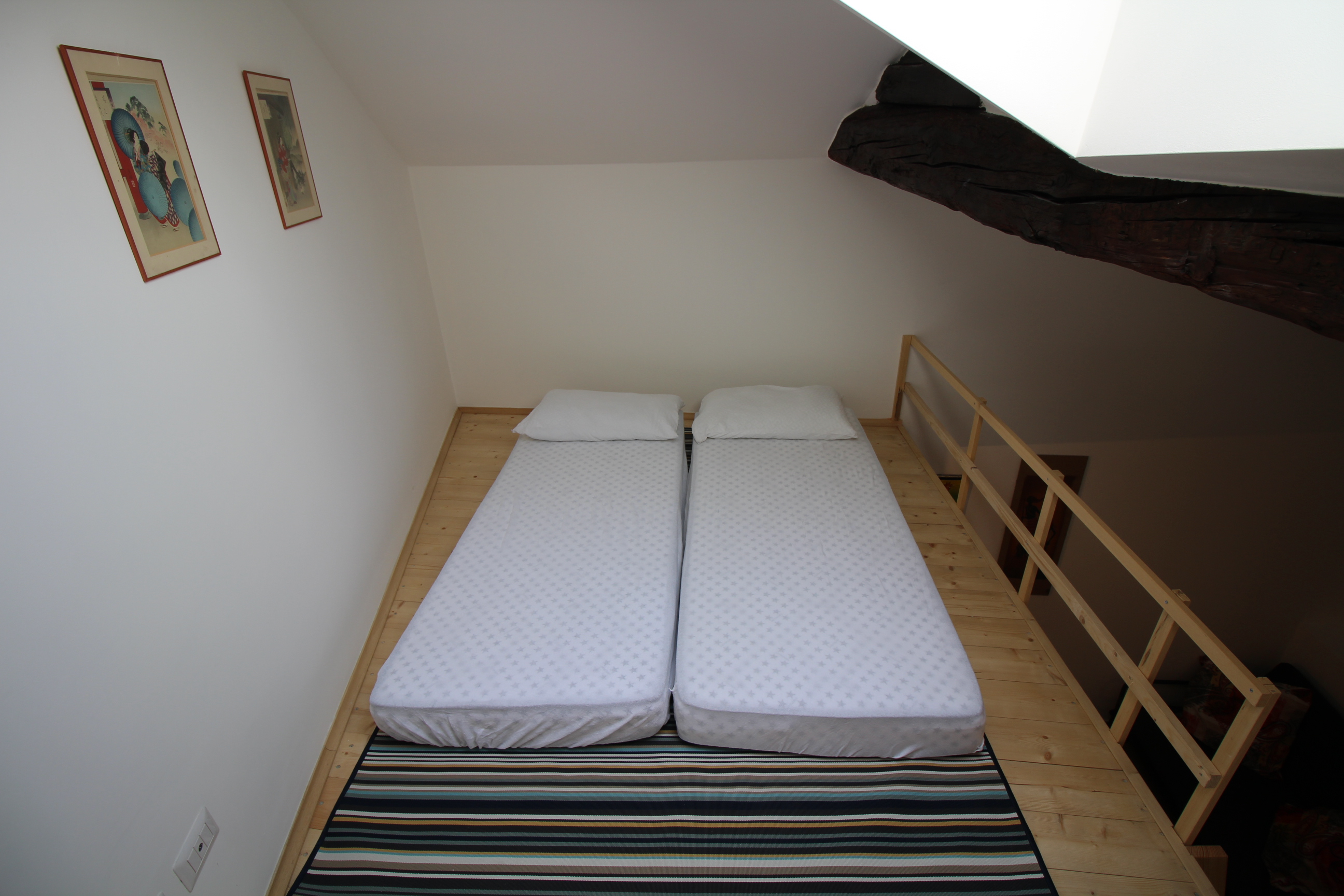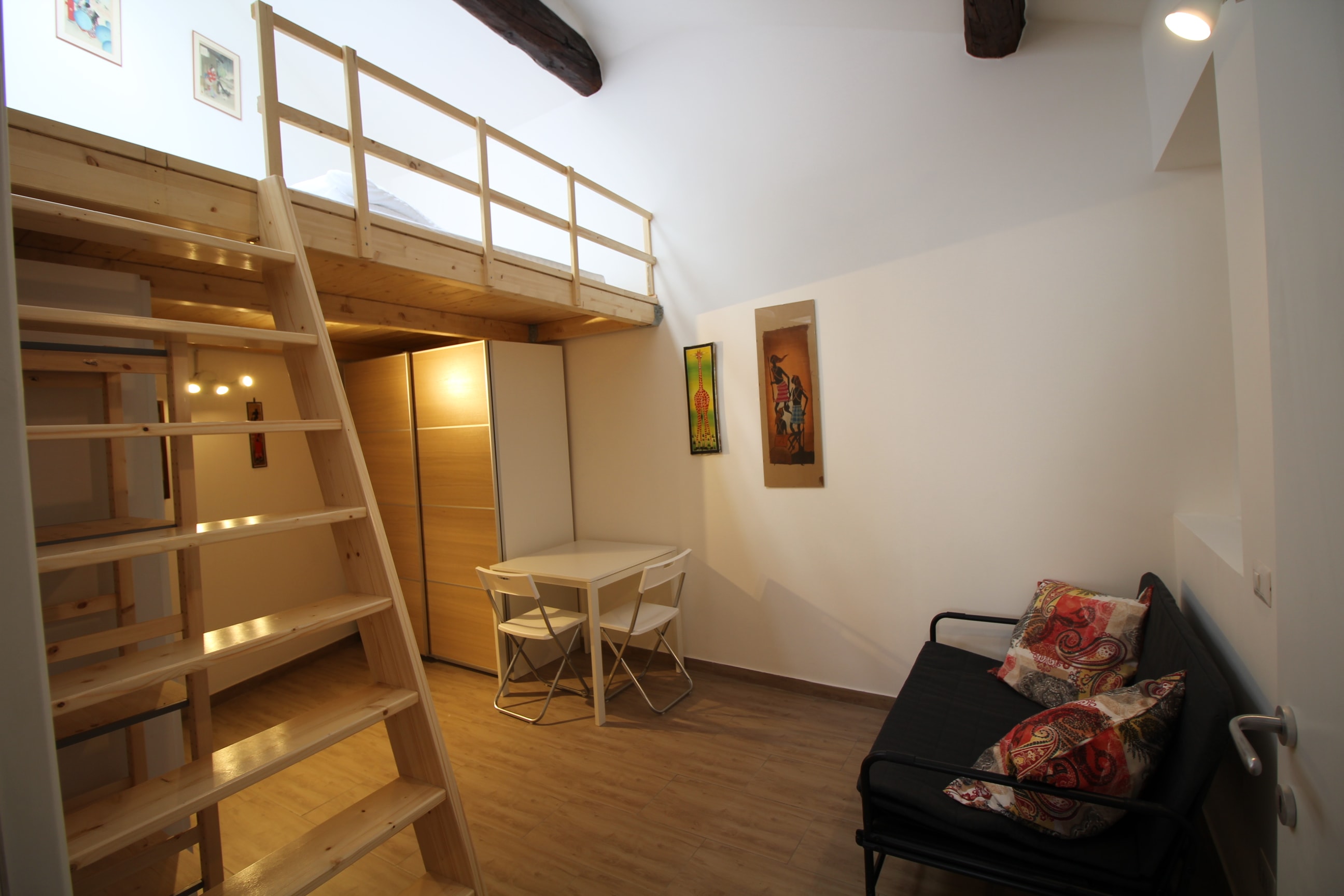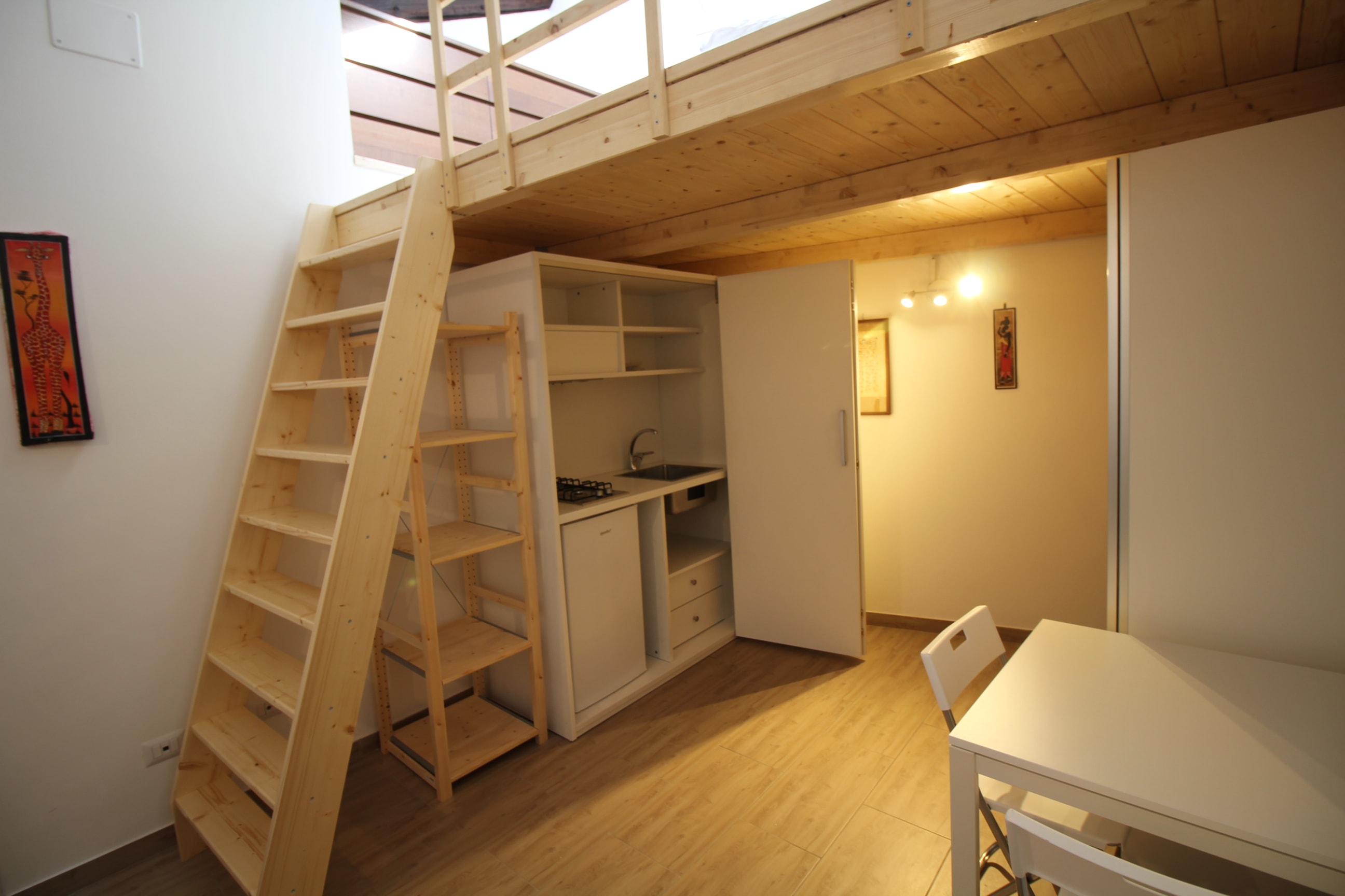 Monolocale per una persona con camera da letto soppalcata. Sotto il soppalco si può trovare una cucina ad armadio completamente accessoriata, tavolo con sedie, divano e armadio.