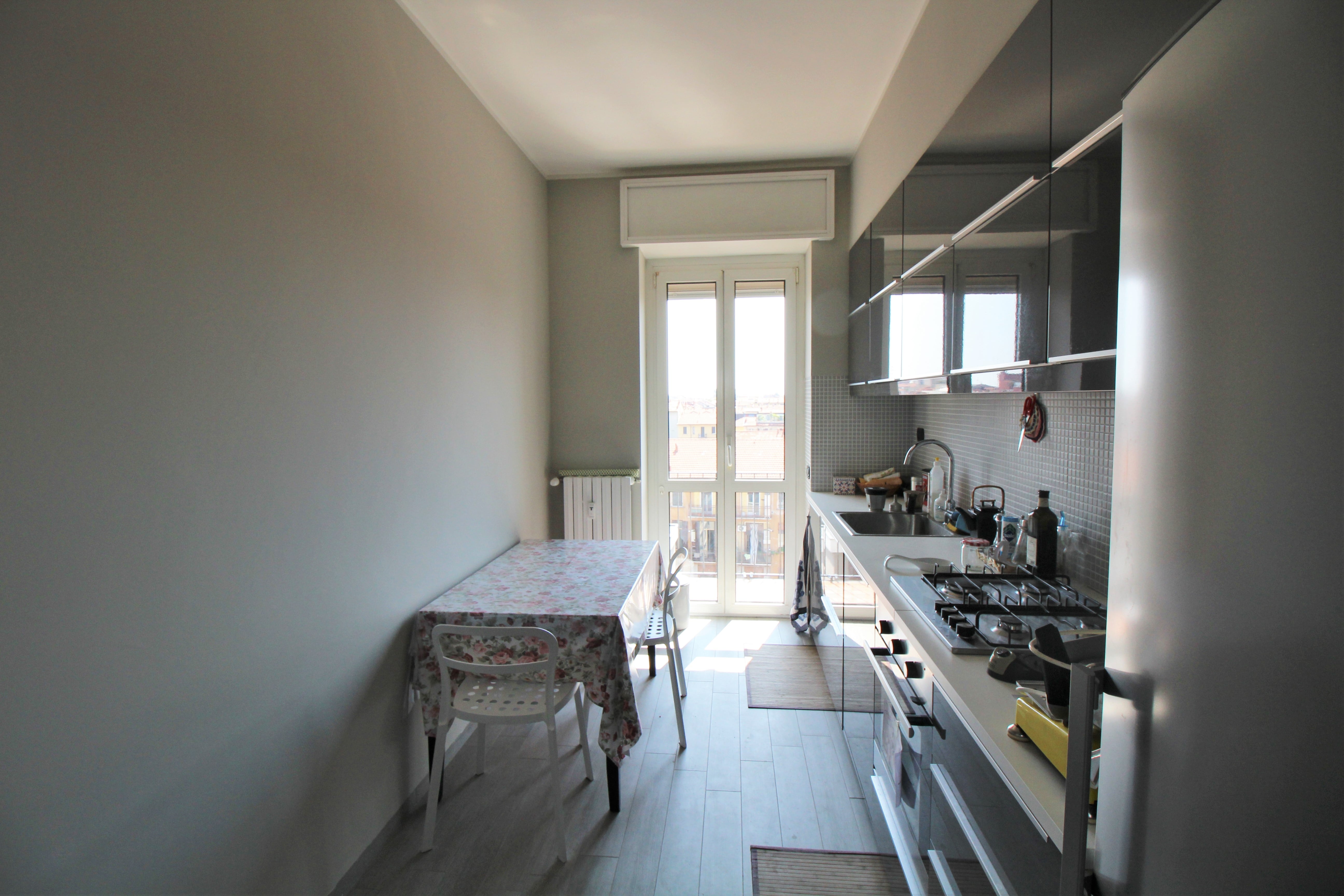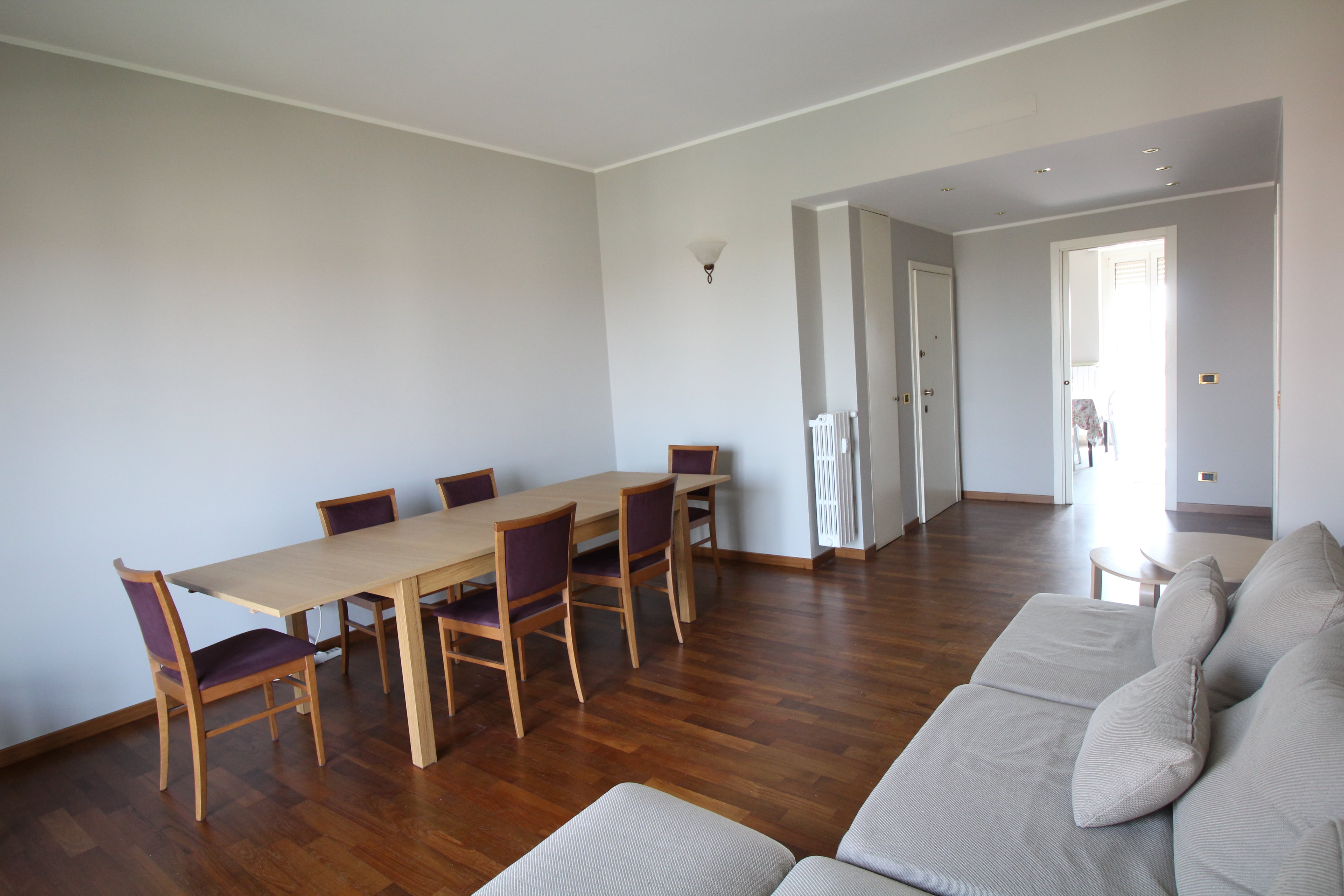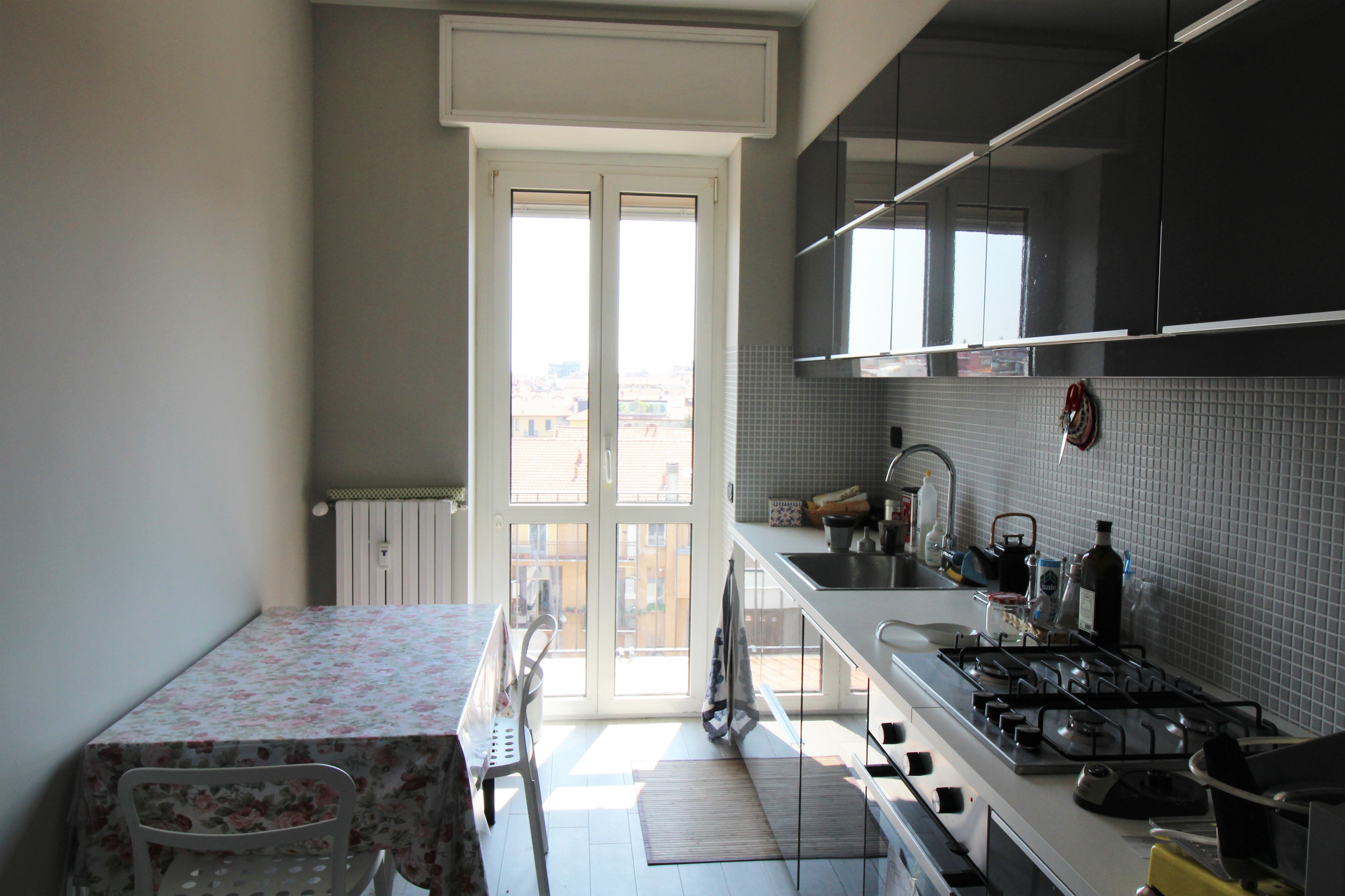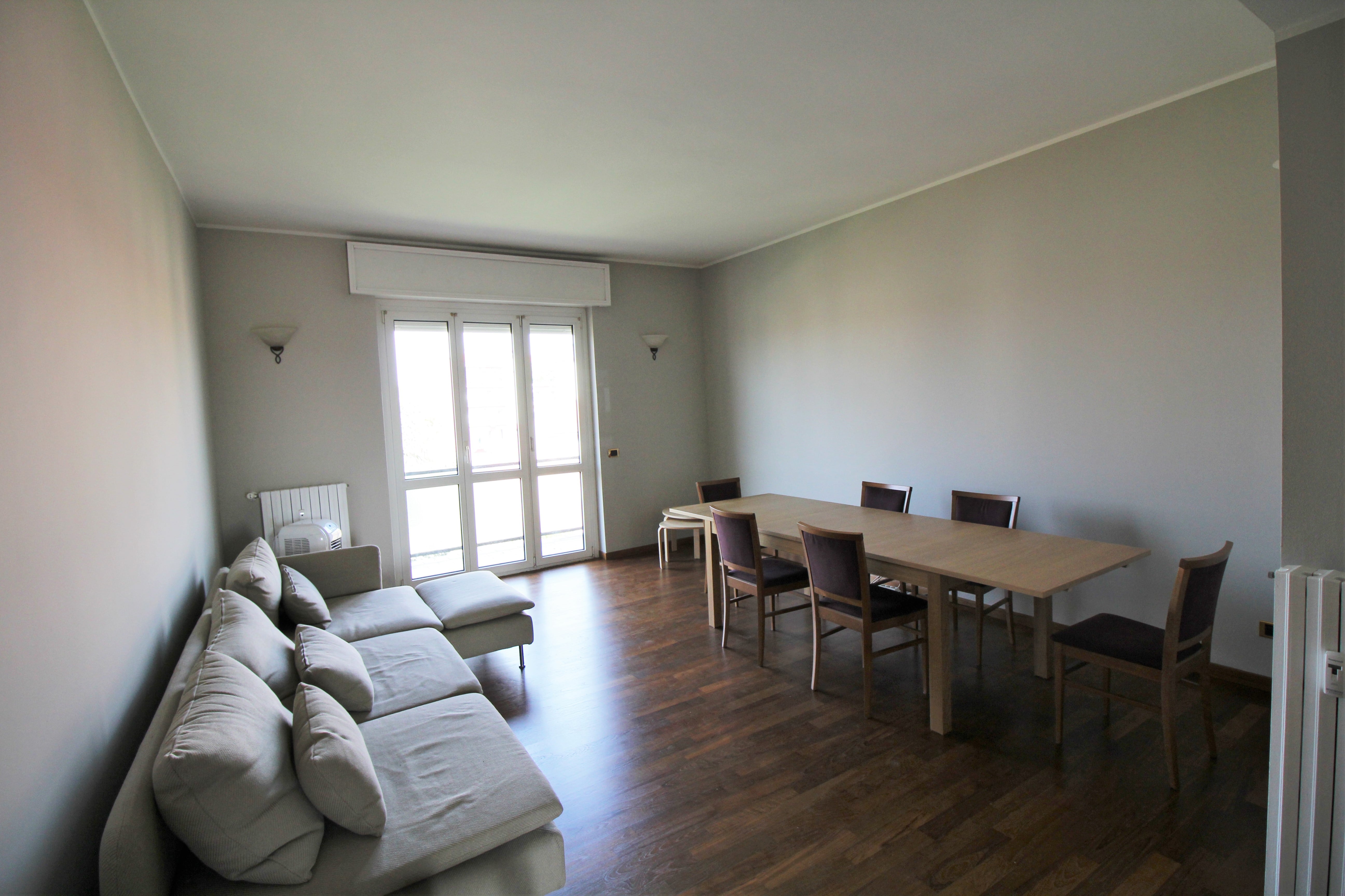 Grande appartamento di 90 metri quadri situato al sesto piano (con ascensore) e composto da ampio ingresso con soggiorno molto spazioso (con balcone), cucina moderna abitabile completamente accessoriata, fornita di lavastoviglie e con balcone adiacente. Le tre camere singole che lo compongono si presentano anch'esse grandi, spaziose e molto luminose e una di essere ha accesso privato al bagno. Il bagno infatti è diviso in due dalla doccia ad uso comune, un lato del bagno con accesso dal corridoio è ad uso comune, mentre l'altro lato ha accesso da una delle tre camere ed è ad uso privato. Appartamento fornito inoltre di ripostiglio ad uso comune situato in fondo al corridoio centrale. Tutte le camere da letto non hanno balcone.