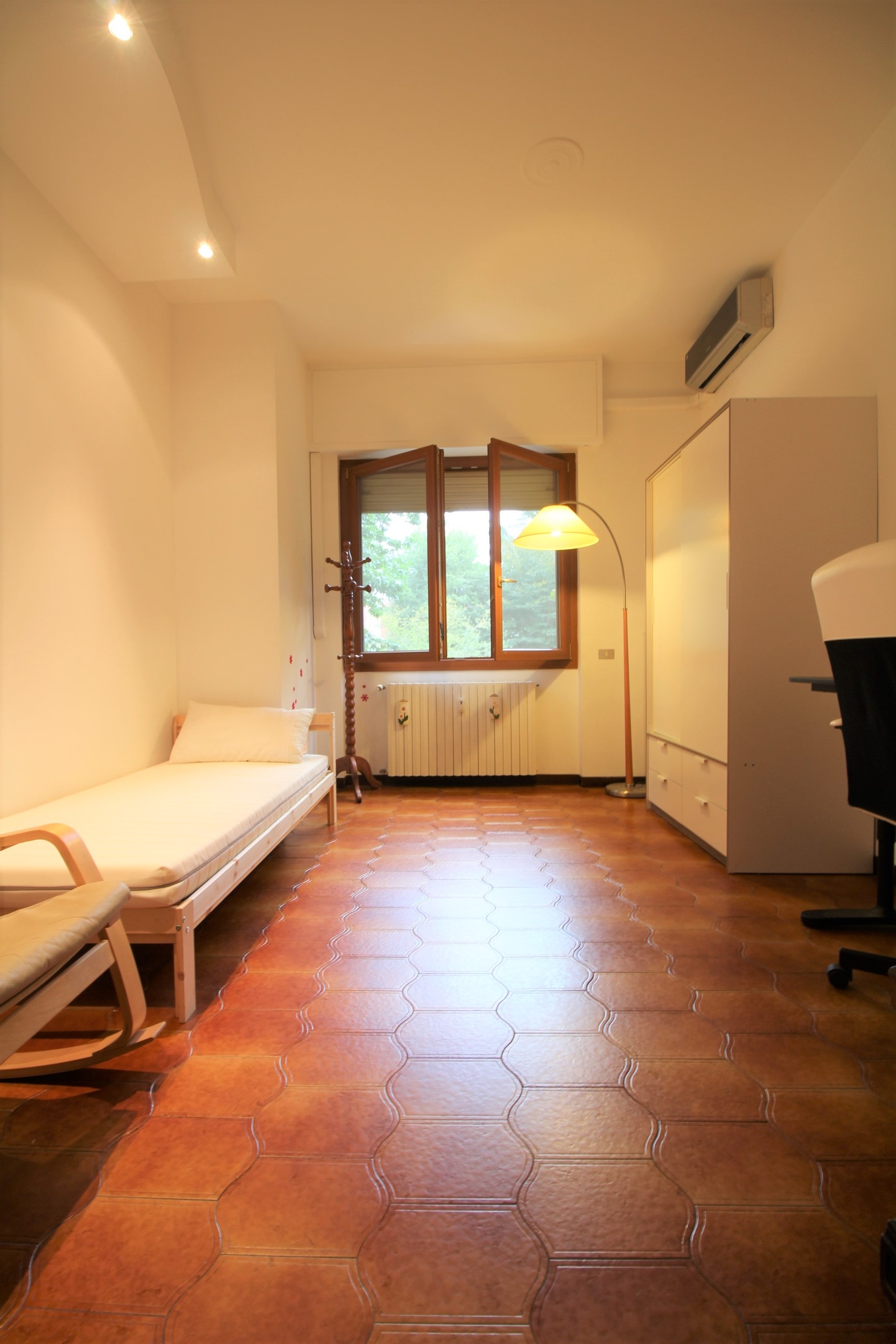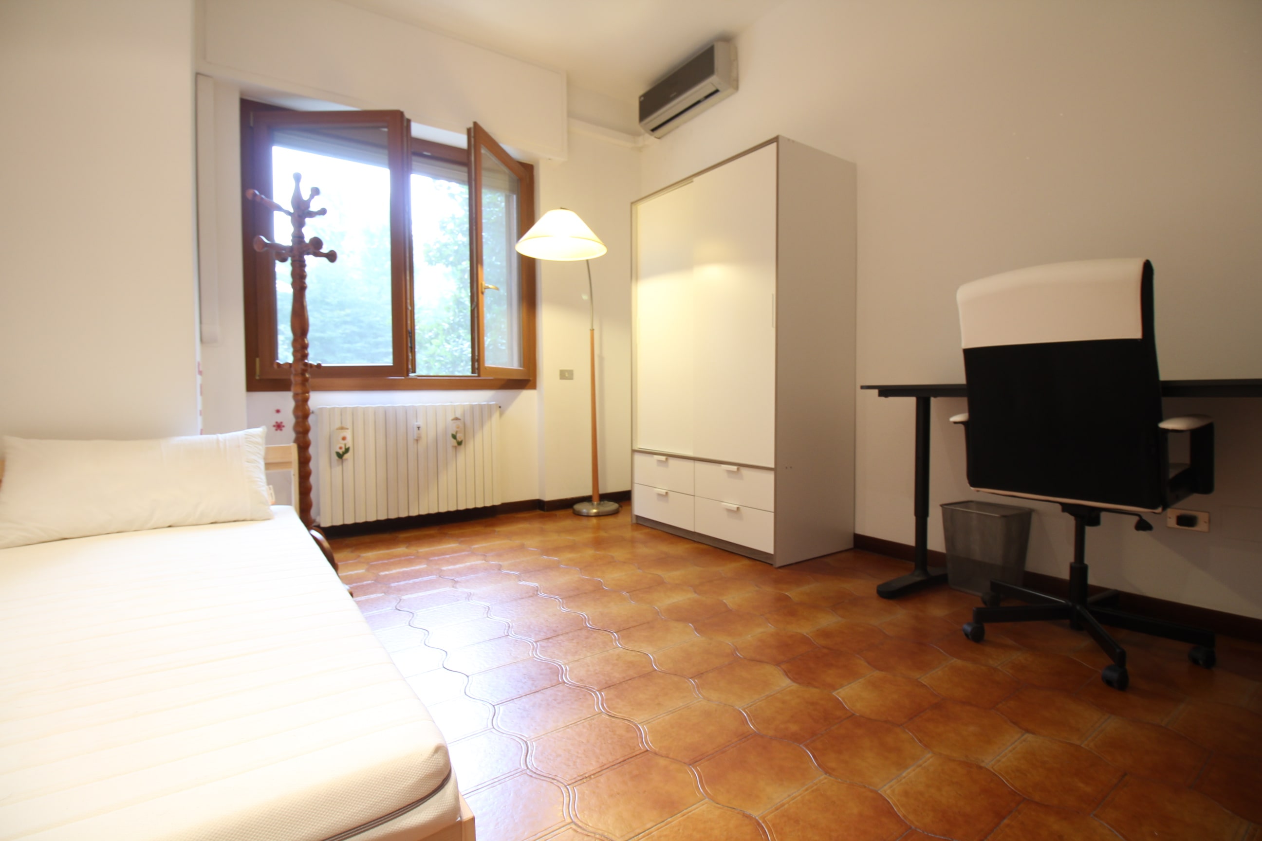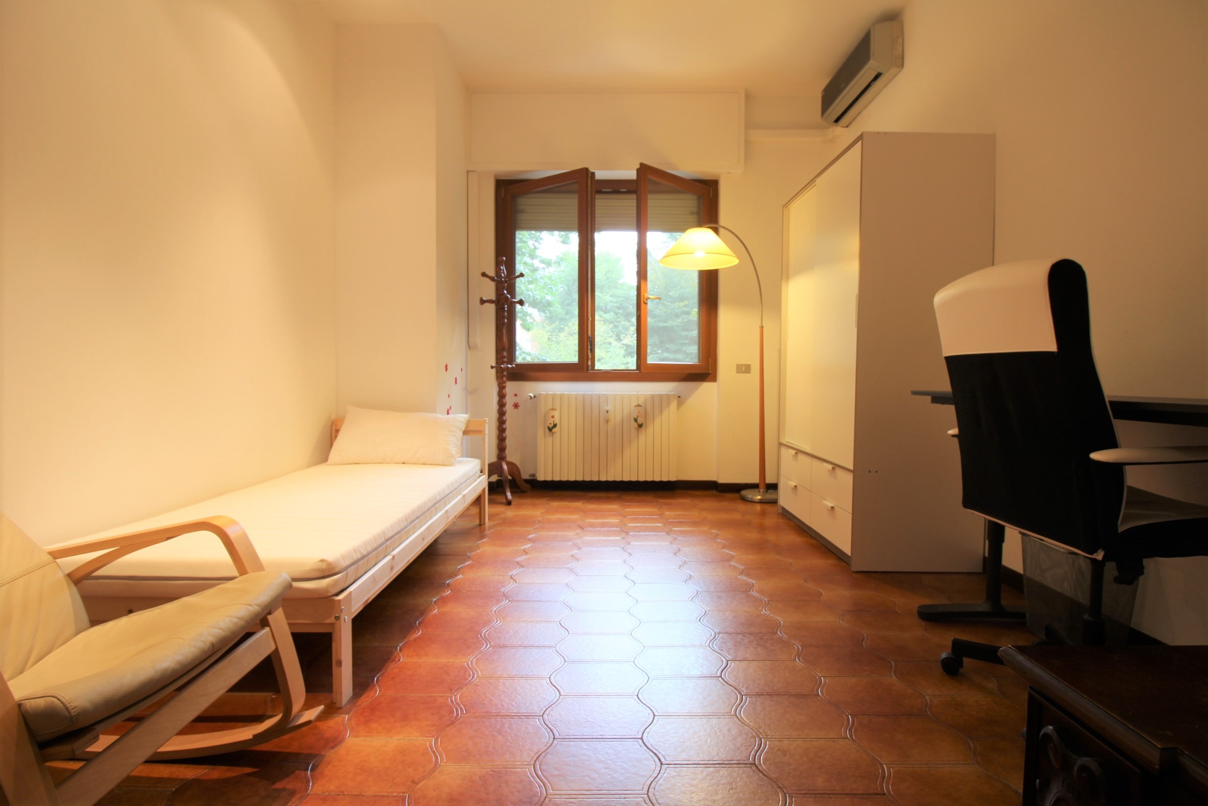 Spaziosa camera singola composta da letto singolo, armadio, scrivania con sedia, e aria condizionata.