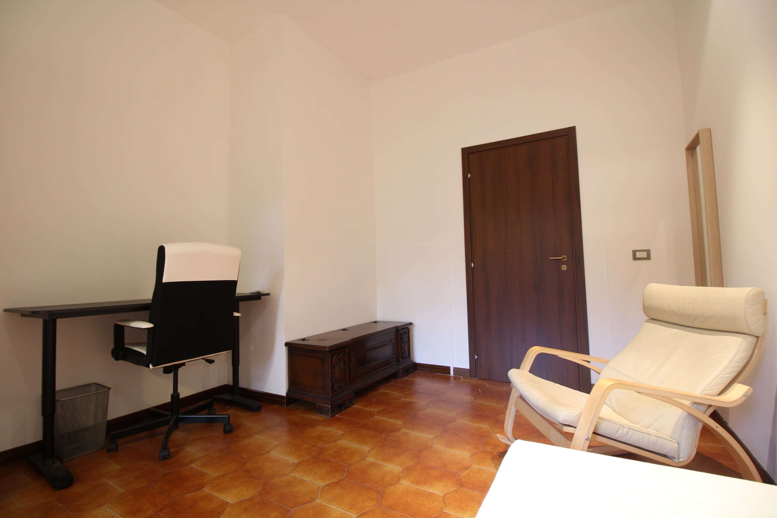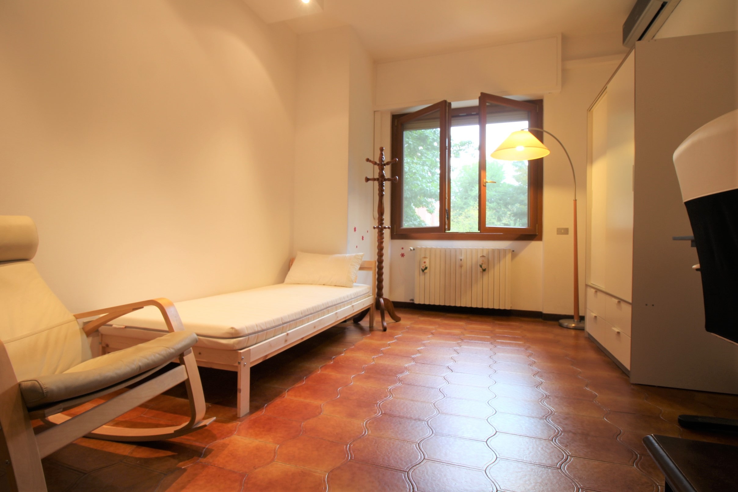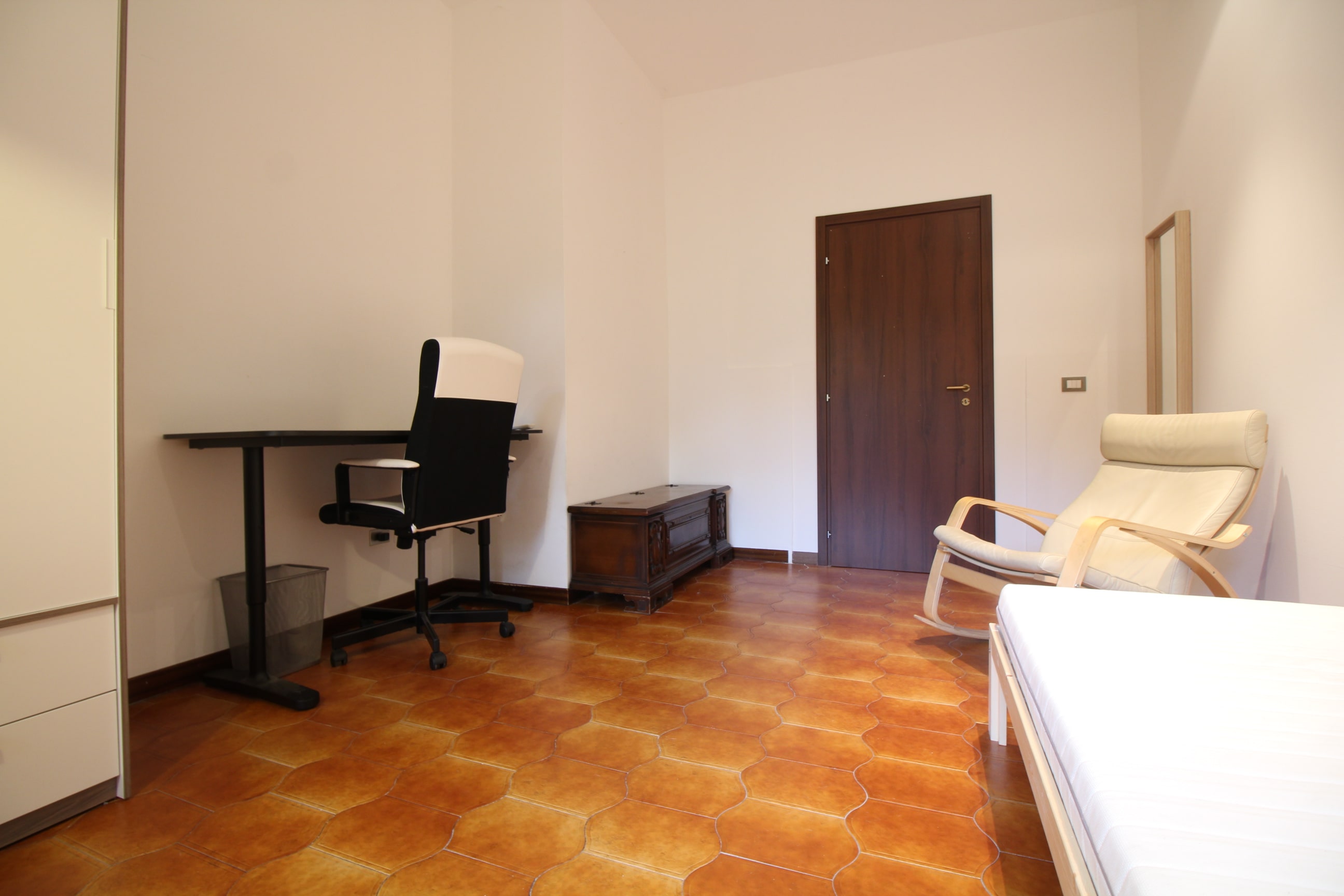 Spaziosa camera singola composta da letto singolo, armadio, scrivania con sedia, e aria condizionata.