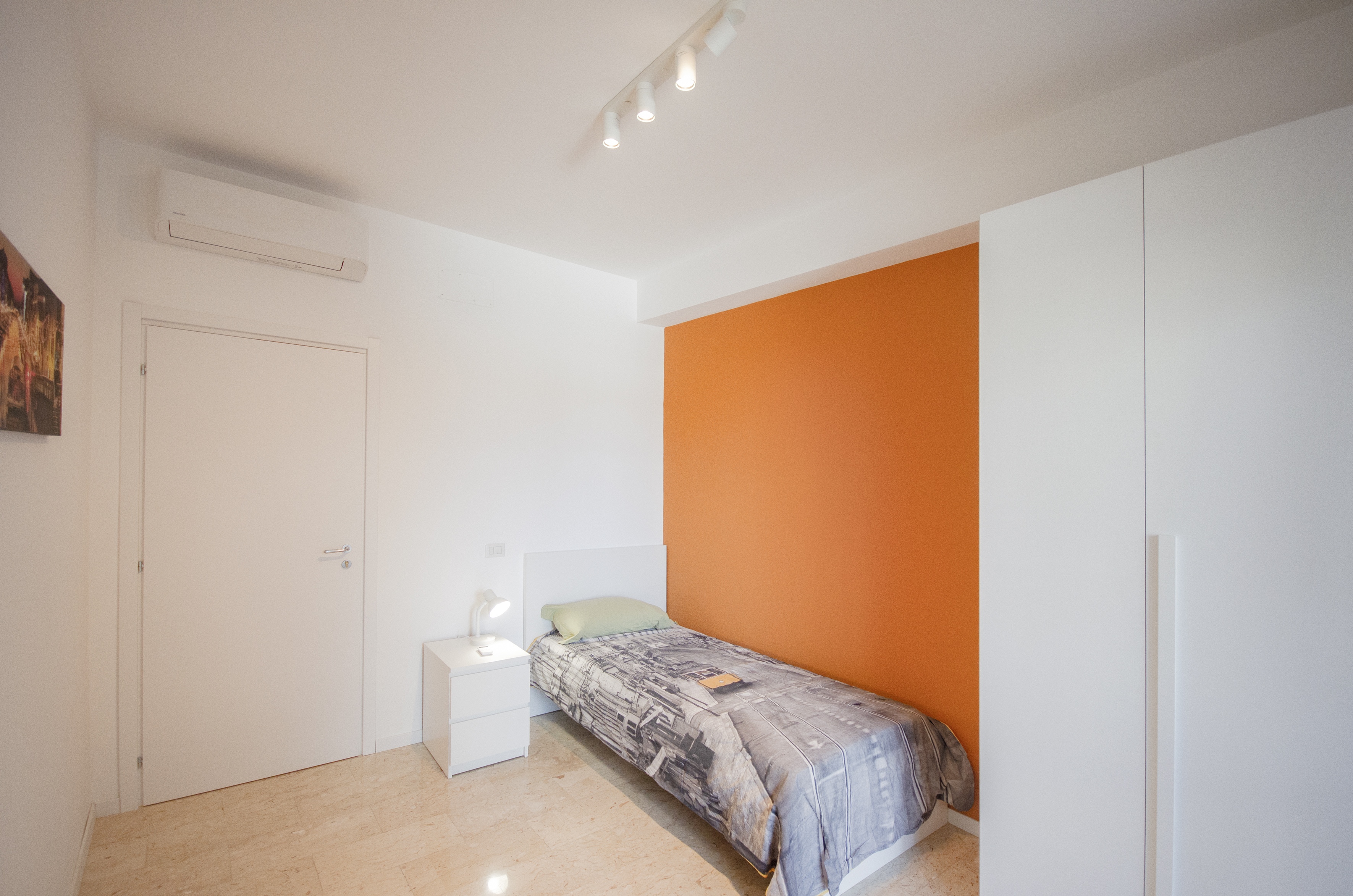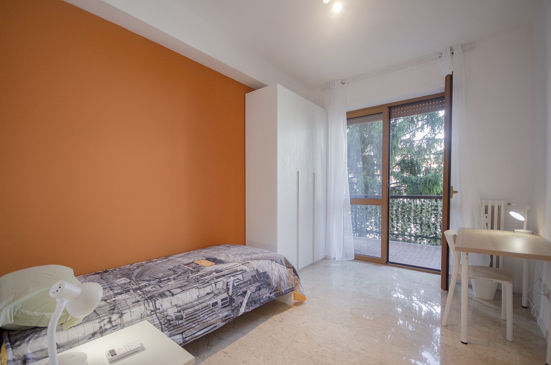 Luminosa camera singola con mobili nuovissimi e balcone condiviso con cucina. Camera da letto provvista di aria condizionata.